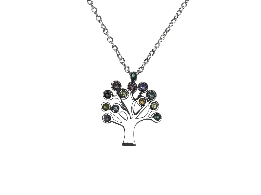 Řetízek s přívěskem Strom života s barevnými zirkony. Délku si sami zvolíte díky prodlouženému zapínání mezi 46 - 50 cm. Chirurgická ocel je velmi pevný a odolný kov s vysokým leskem. Šperky z tohoto kovu mají stálou barvu a jsou vhodné i pro alergiky.