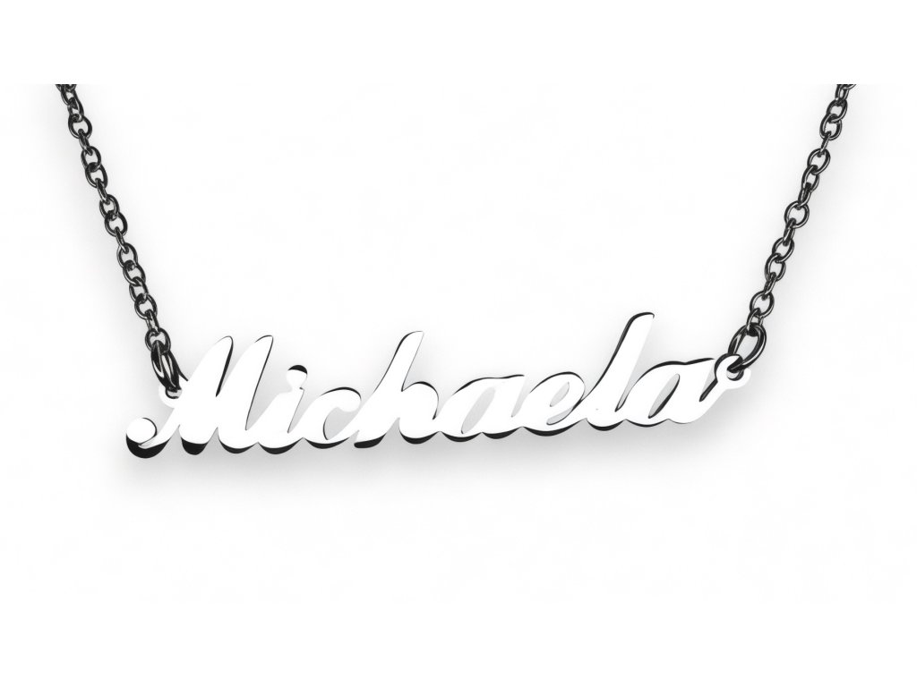 Řetízek z chirurgické oceli se jménem Michaela. Řetízek má nastavitelné zapínání, můžete si zvolit délku od 45 do 50 cm. Chirurgická ocel je velmi pevný a odolný kov s vysokým leskem. Šperky z tohoto kovu mají stálou barvu a jsou vhodné i pro alergiky.